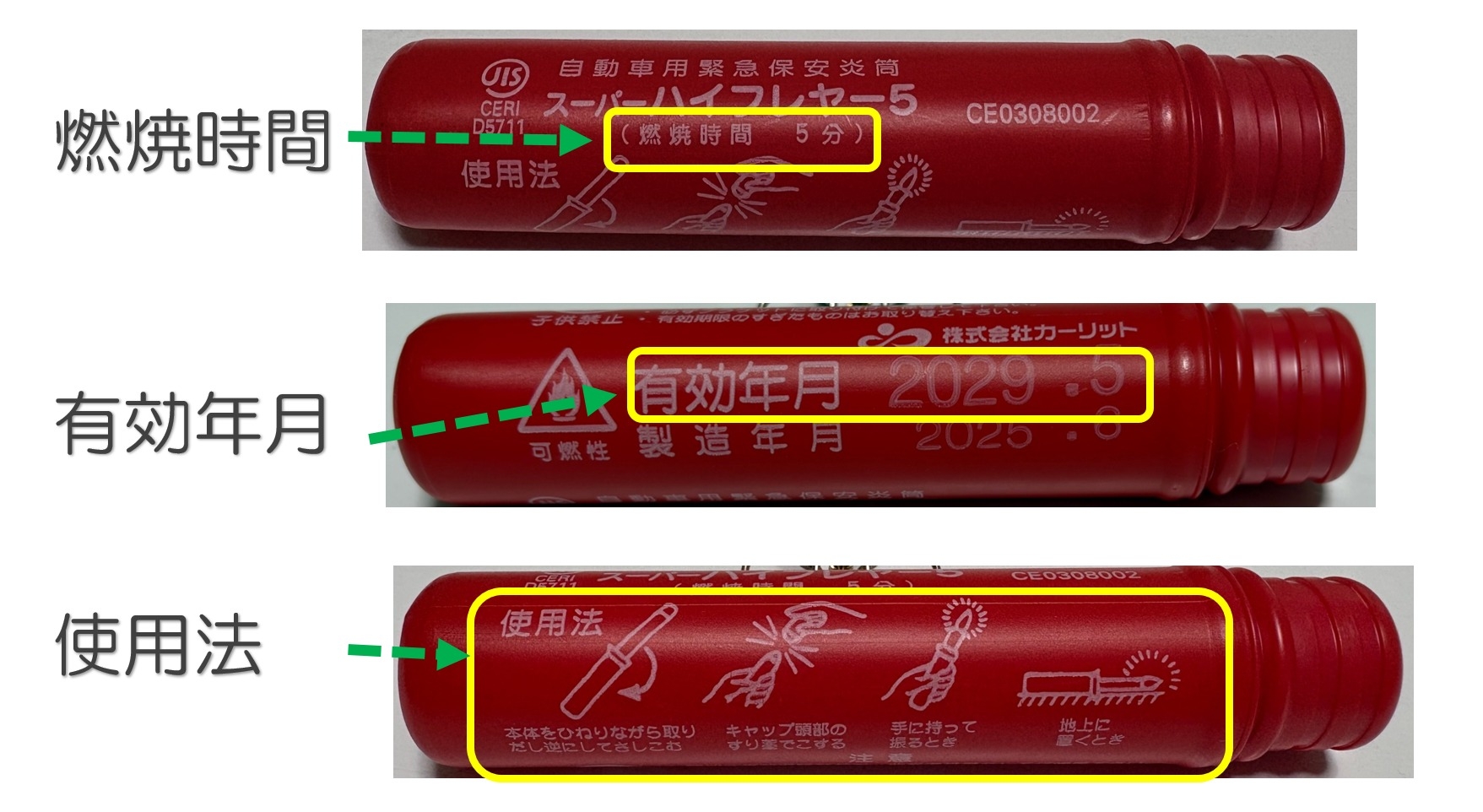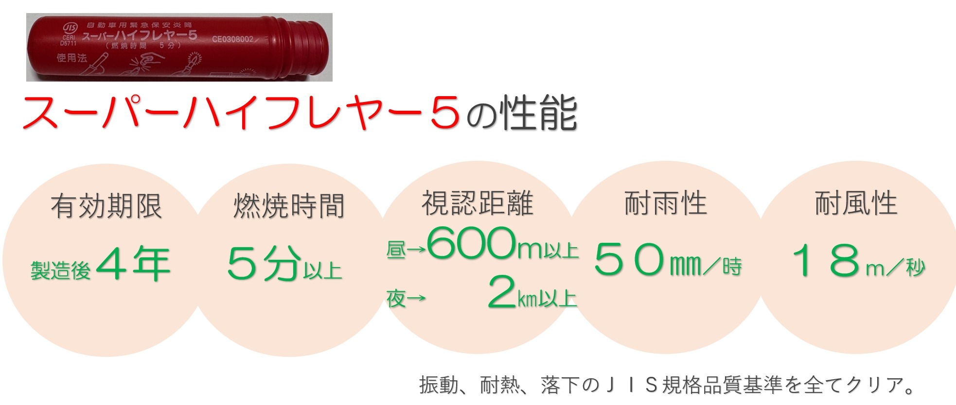 鮮明な炎と少量の煙で後続車に危険を知らせてくれる物です。