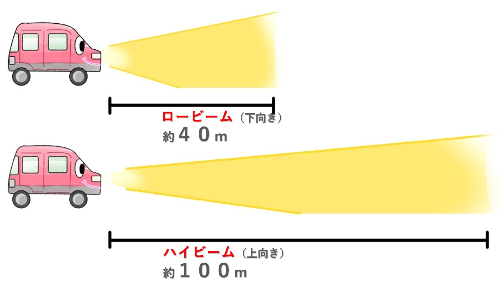 夜間、ハイビームで走行した場合には、ロービームの場合よりも2倍以上遠くから早期に発見することができます。
