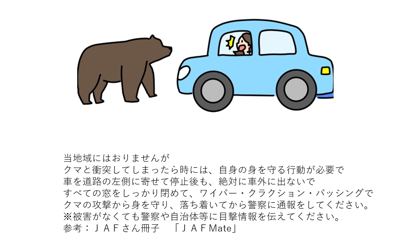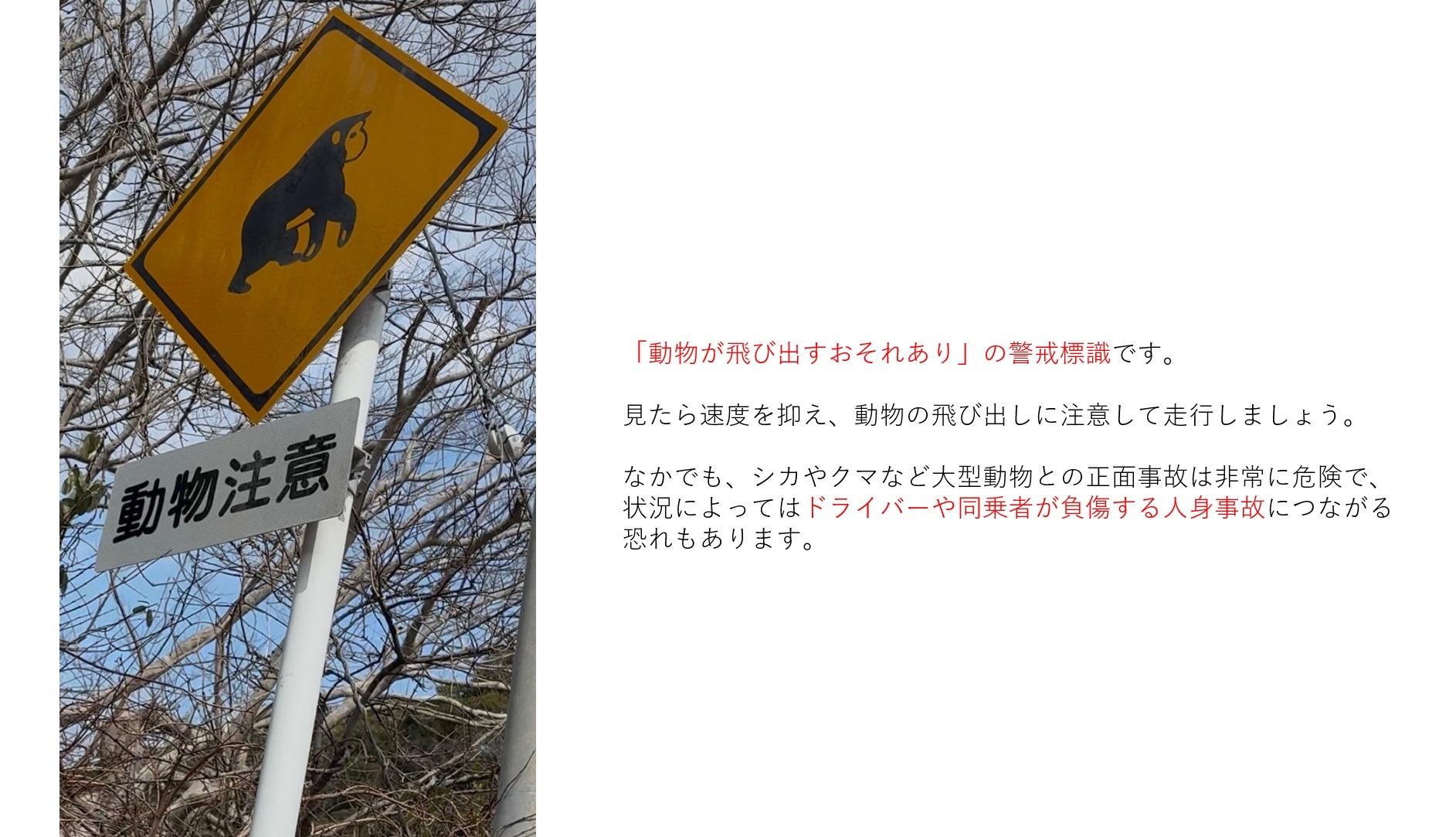 野生動物は夜行性動物が多いので、特に夜間から早朝は慎重な運転をお心がけください。