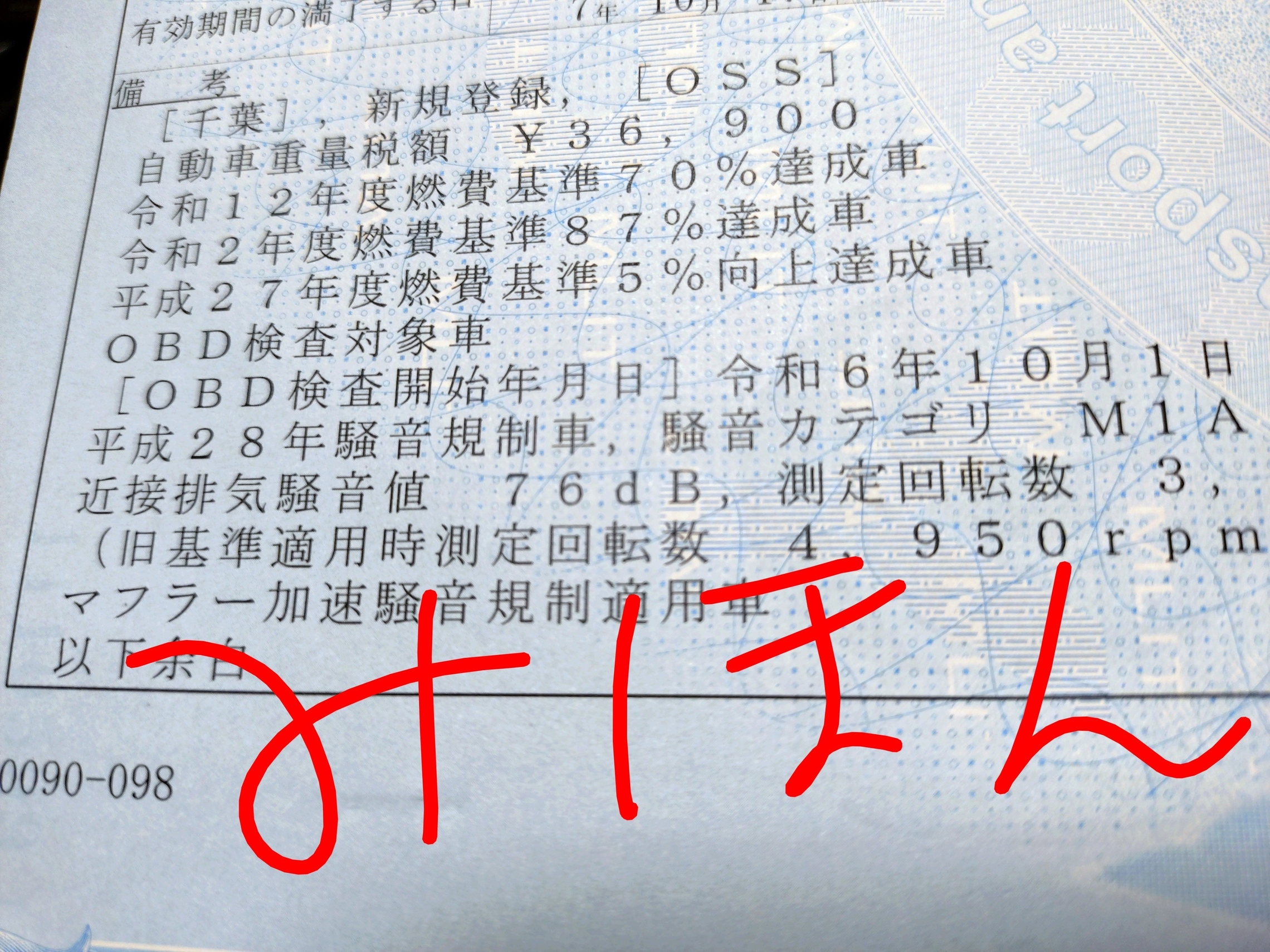 車検証の備考欄に「OBD検査対象車 」と記載があります。