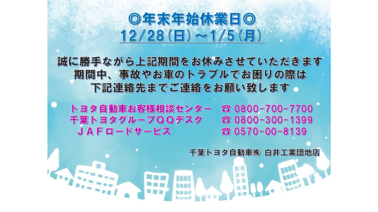 年末年始休業日のお知らせ 2025.11.28 千葉トヨタ白井工業団地店 年末年始休業日 お世話になっております 白井工業団地店です(^^♪ 年末年始休業日のお知らせをさせていただきます ご迷惑をお掛けいたしますがどうぞ宜しくお願い致します 千葉トヨタ自動車㈱ 白井工業団地店 ☎ 047-492-3331 前の記事へ 店舗ブログ一覧に戻る 次の記事へ