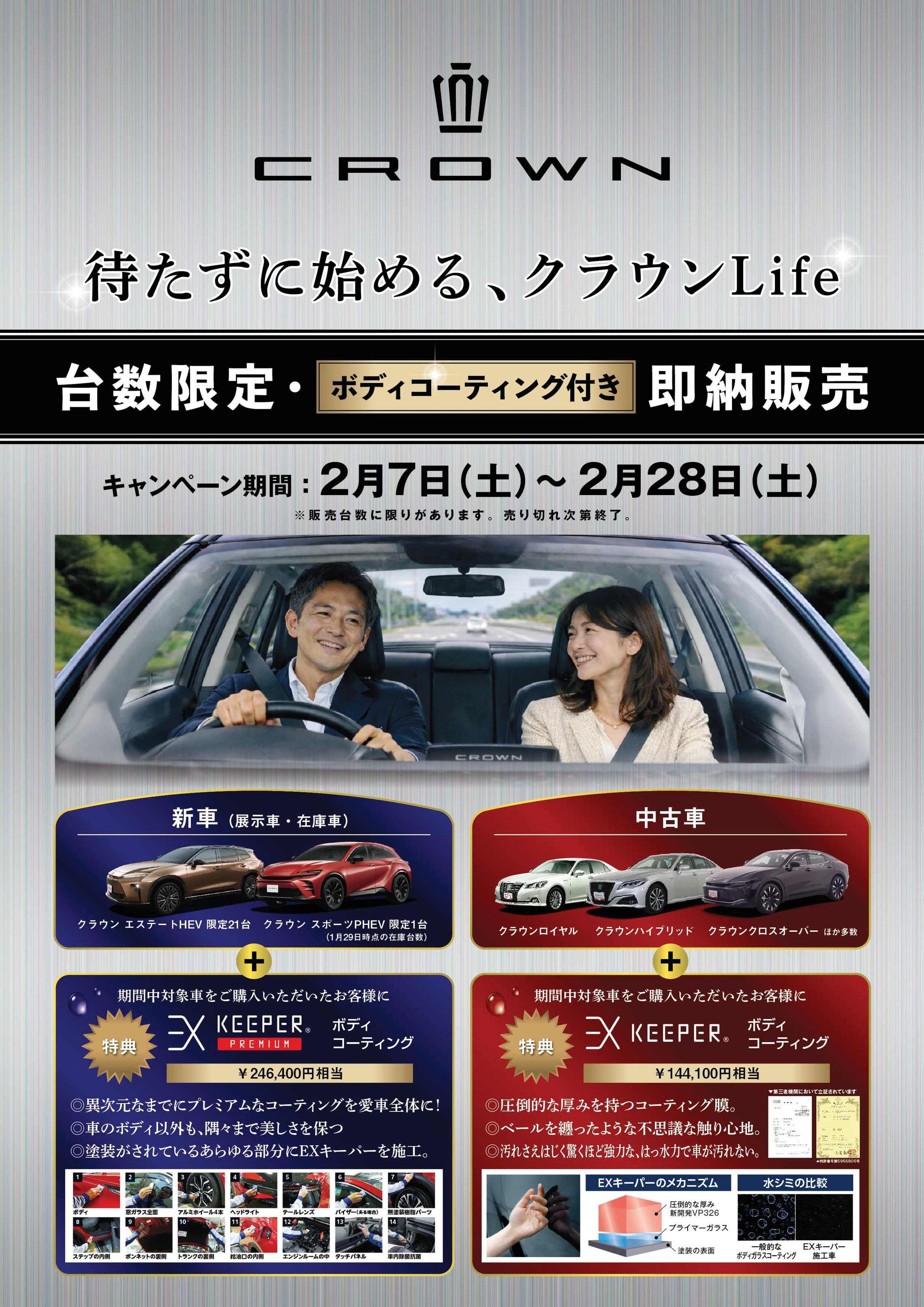 🚗千葉トヨタクラウンDAY🚗 2026.02.15 皆様こんにちは😊 いつもアレス穴川店のブログをご覧いただきありがとうございます😊 台数限定・ボディコーティング付き 即納販売のお知らせ 期間中、千葉トヨタ在庫「中古車クラウン」を成約いただいたお客様に 高級ボディーコーティング「EXキーパー」を施工します 販売台数に限りがあります。売り切れ次第終了 千葉トヨタの残価型プランなら月々のお支払いも楽々です 皆様のご来店お待ちしております 前の記事へ 店舗ブログ一覧に戻る 次の記事へ