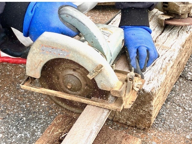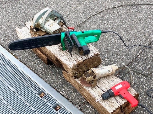 左から 電動ノコギリ 電動チェ-ンソ- 電動切削機 電動ドリル (すべて家庭用・各々の合計出力1500W以下の機器を使用)