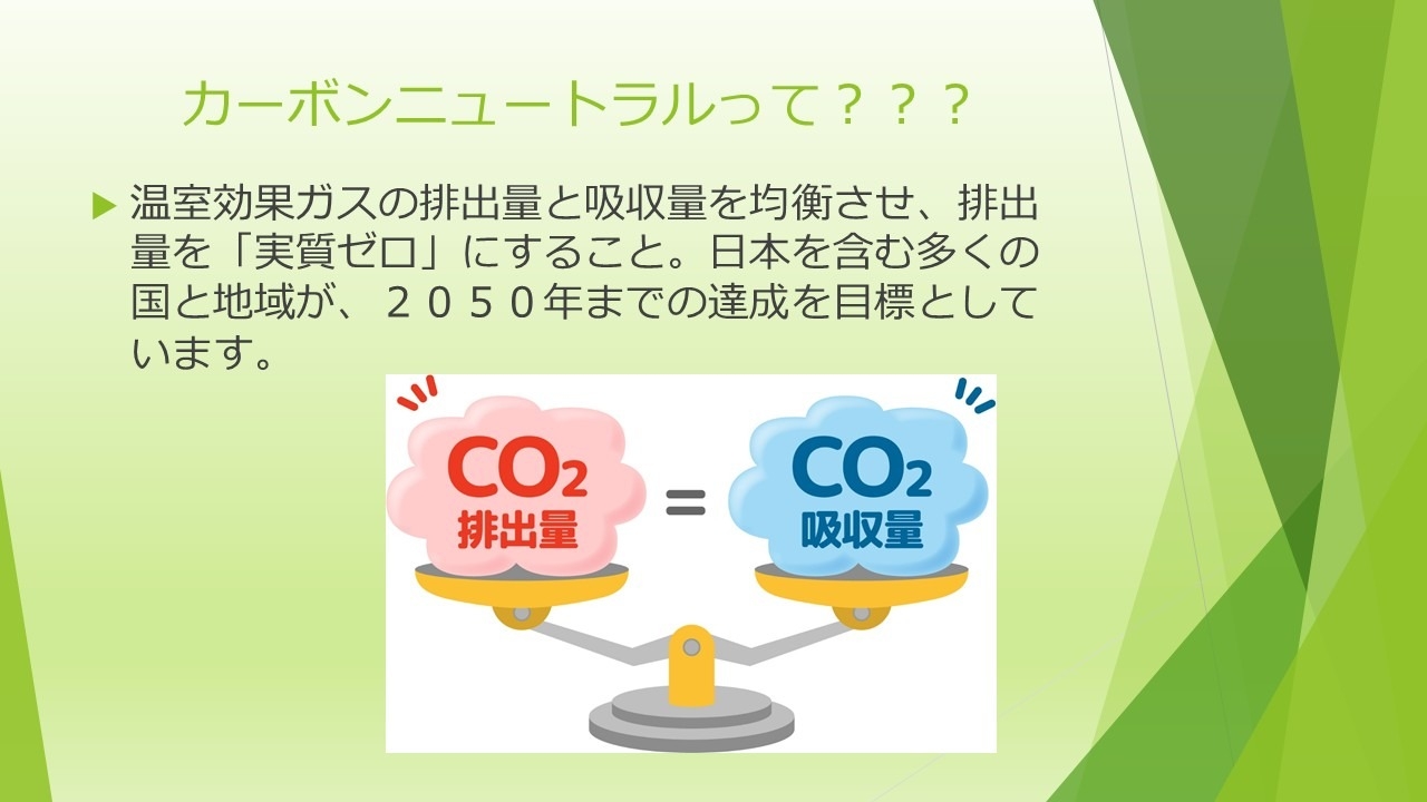 温室効果ガスの排出量と吸収量を均衡させ、排出量を「実質ゼロ」にすること。