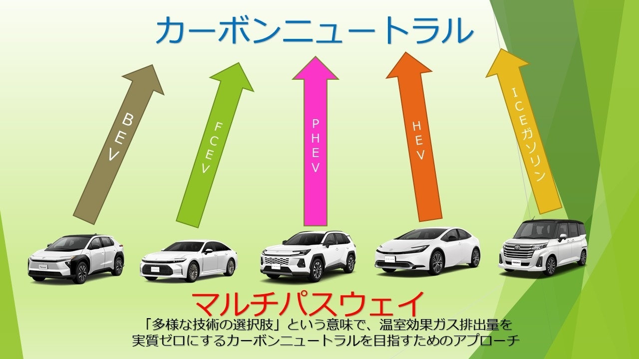 多様な選択肢(BEV・PHEV・HEV・エンジン・FCEVなど)を準備して、カーボンニュートラル達成を目指すアプローチ。